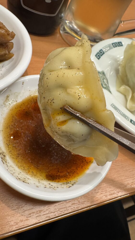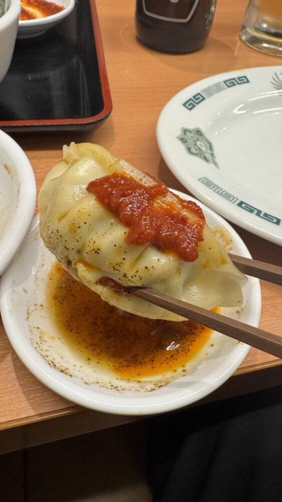 ▲餃子も秘伝の辛味噌で味変。辛旨な餃子もお酒に合いますね。この日はこれで締め。