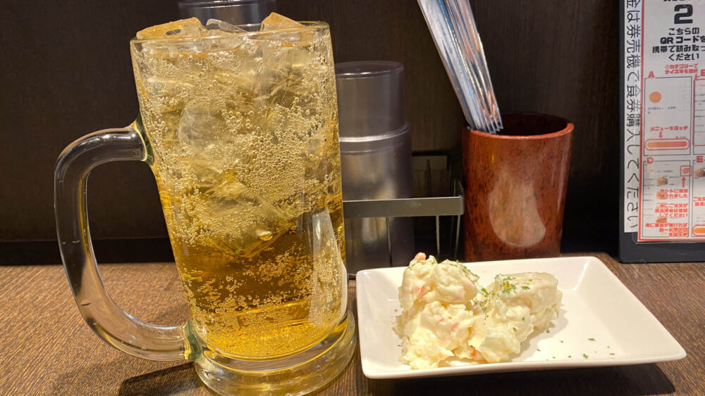 ▲まずはメガハイボールとおつまみポテトサラダが到着。ハイボールでのどを潤します。ジョッキがめちゃデカです(笑)