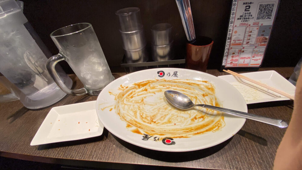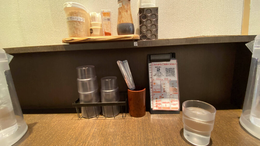 ▲卓上調味料は天かすガーリック、一味唐辛子、ソース。現金以外の決済なら卓上のQRコードから行えます(席着くまで気づきませんでした)。