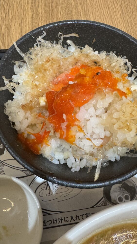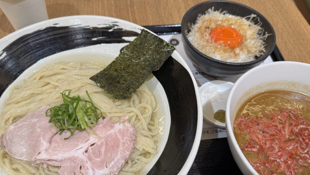 今回は海老昆布水つけめん+麺大盛+真っ赤卵TKGを注文しました!
