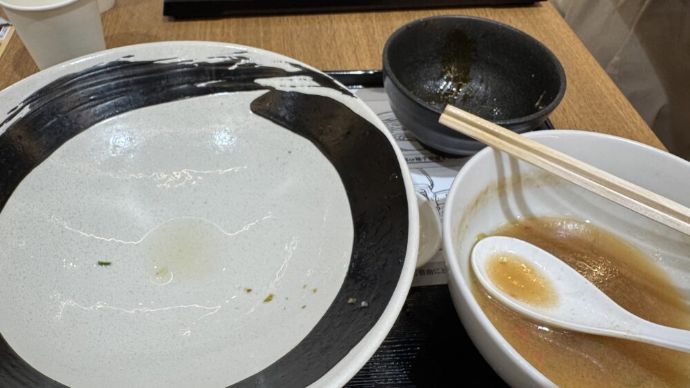 ▲麺を食べ終えたら、昆布水をつけ汁へ投入して割スープに。間違いない美味しさ。