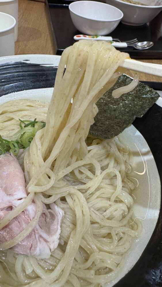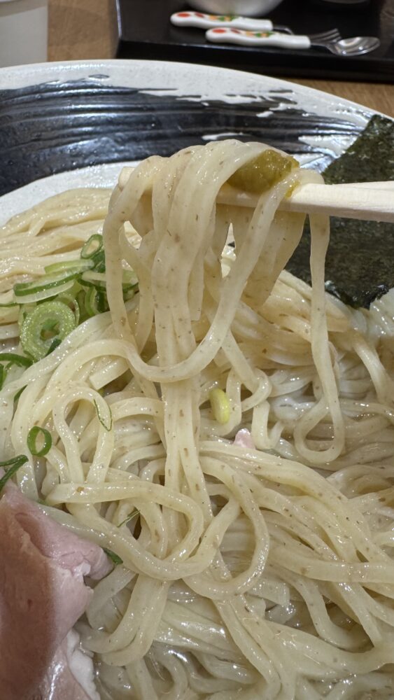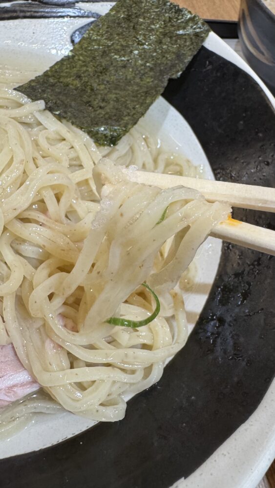 ▲おすすめの食べ方に沿って、麺に付属の塩を付けて食べるとめちゃ旨。塩味の後に昆布水の旨味が際立ちます。