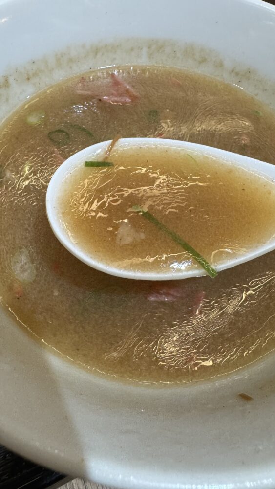 ▲つけ汁は、海老の旨味が効いています。角切りチャーシューも入っていて嬉しい。
