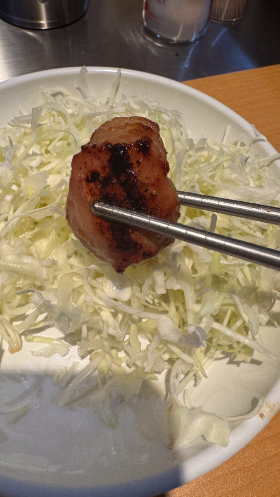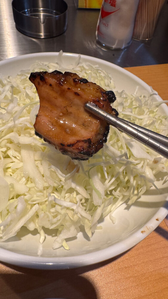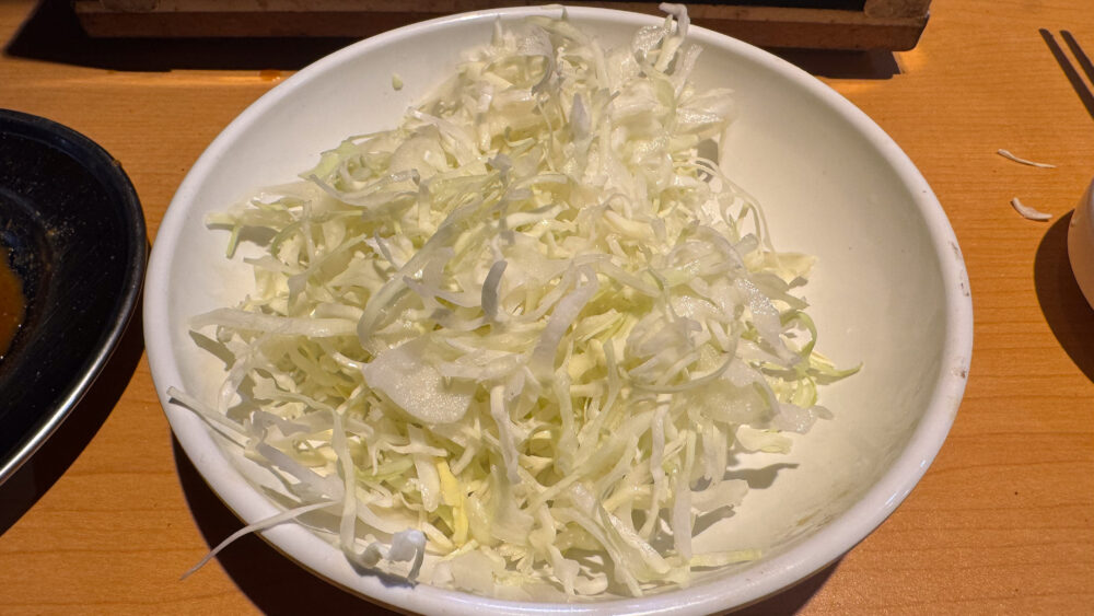▲キャベツを再度お替り。ホルモンの脂と濃いめのタレを中和するのに、キャベツがめちゃ捗ります。