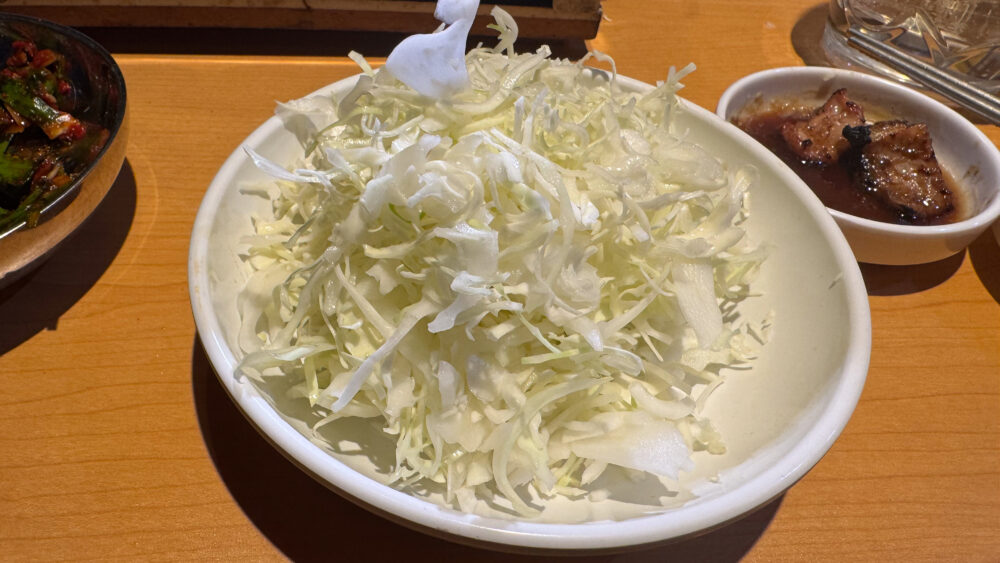 ▲お通しのキャベツもお替り自由。ライス代わりにもなるので追加注文しました。