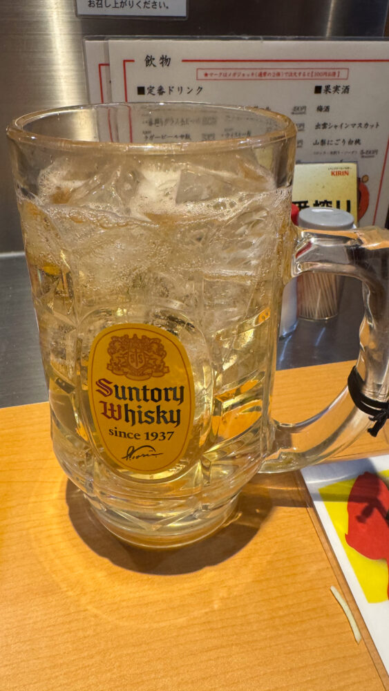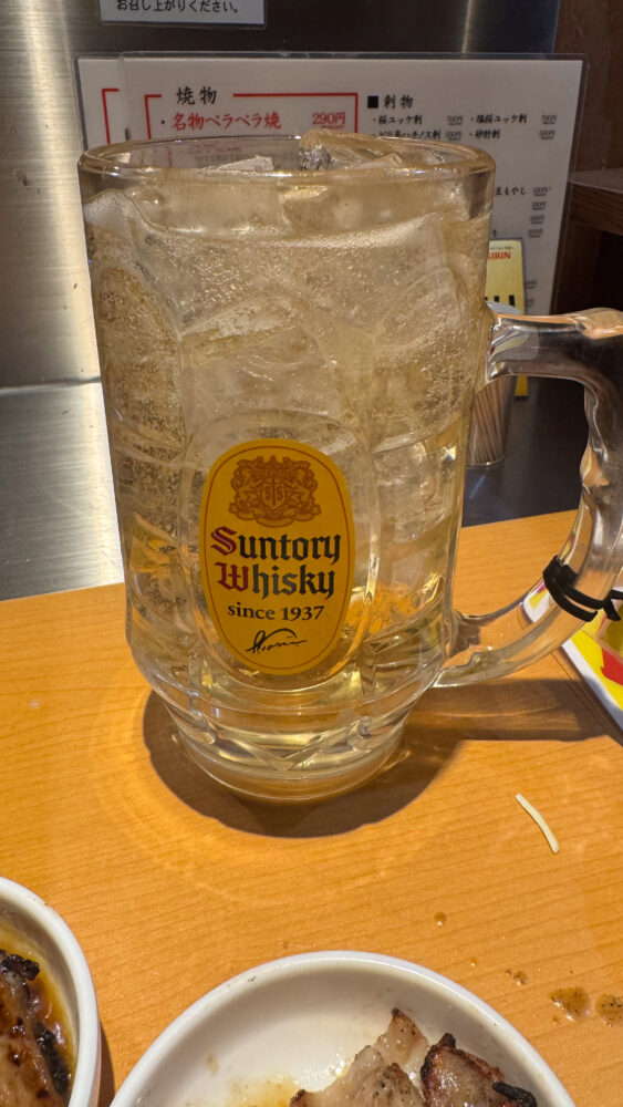 ▲2杯目は角メガハイボール。ハイボールのキリっと感もホルモンに合いますね!