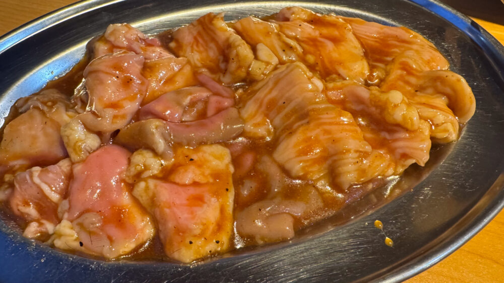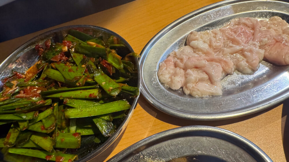 ▲牛シマチョウと牛ギャラが着皿。おそらく右側が牛シマチョウ、左側が牛ギャラ。