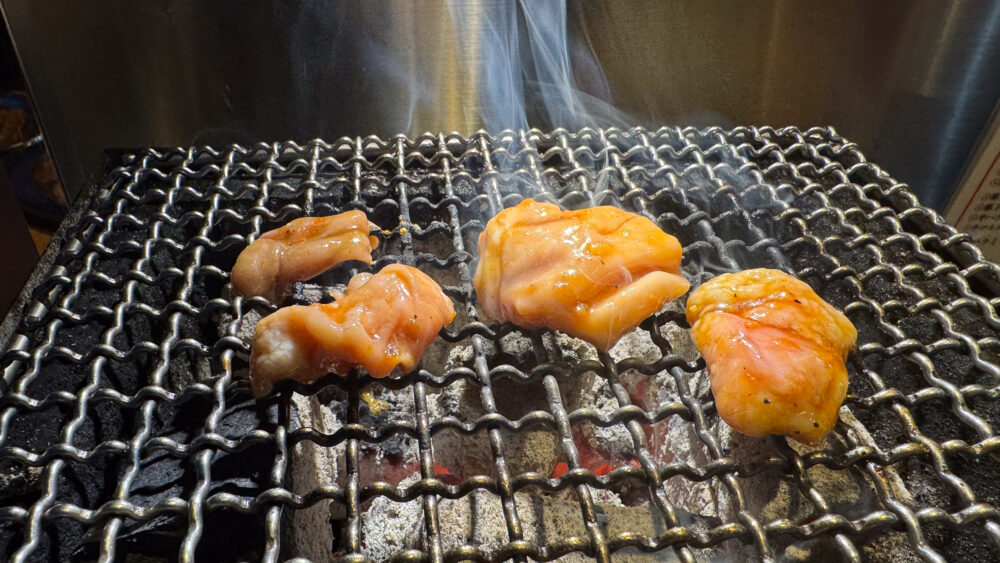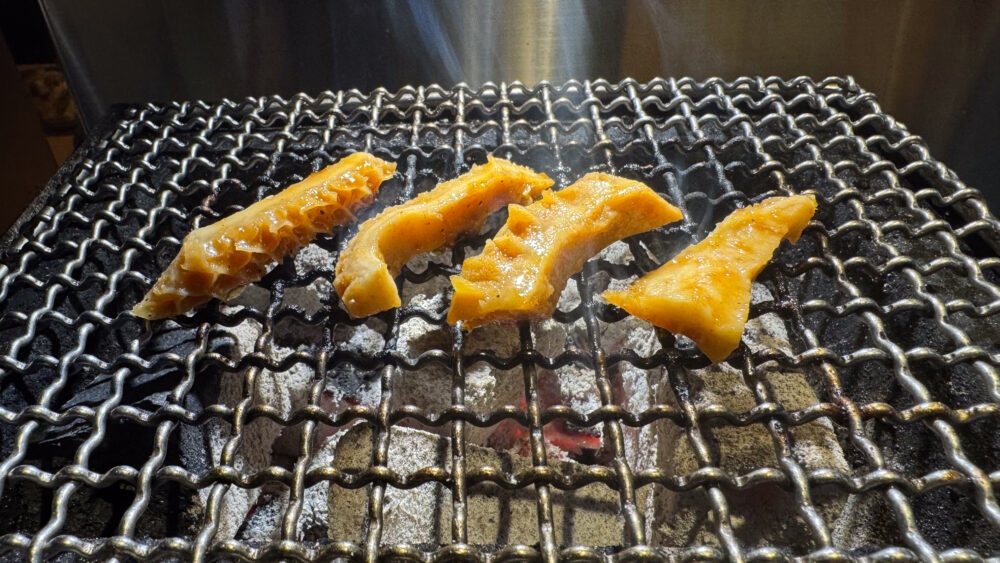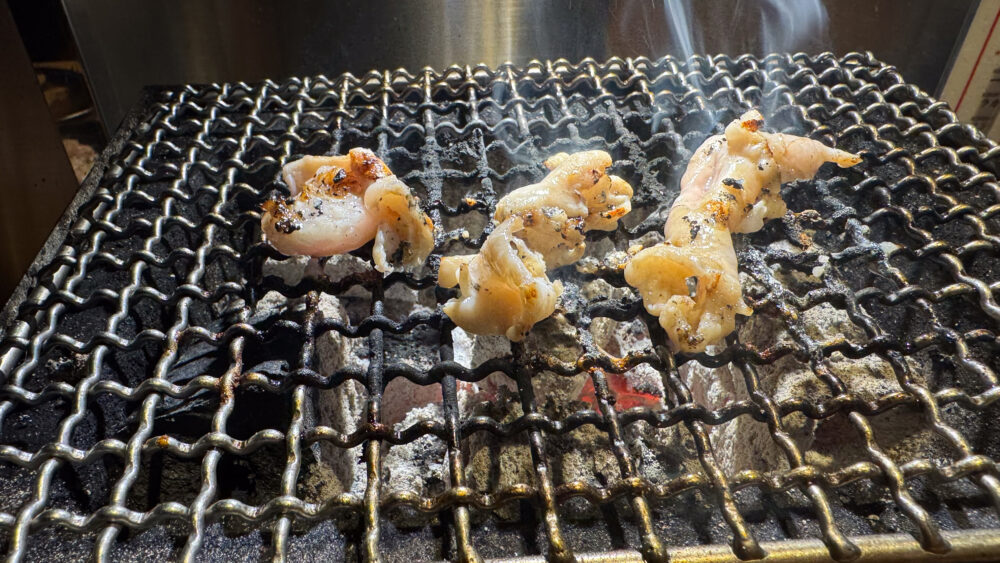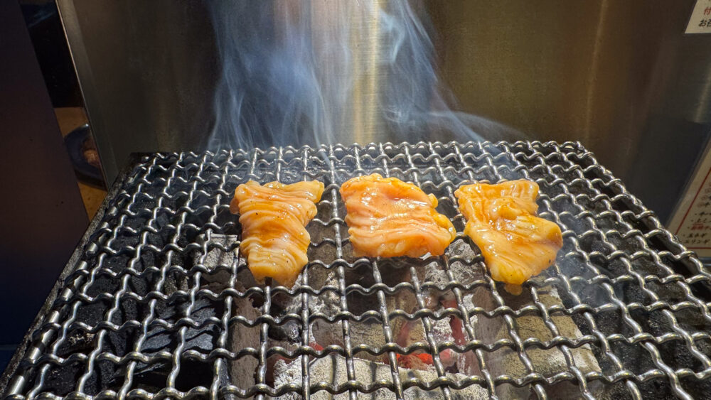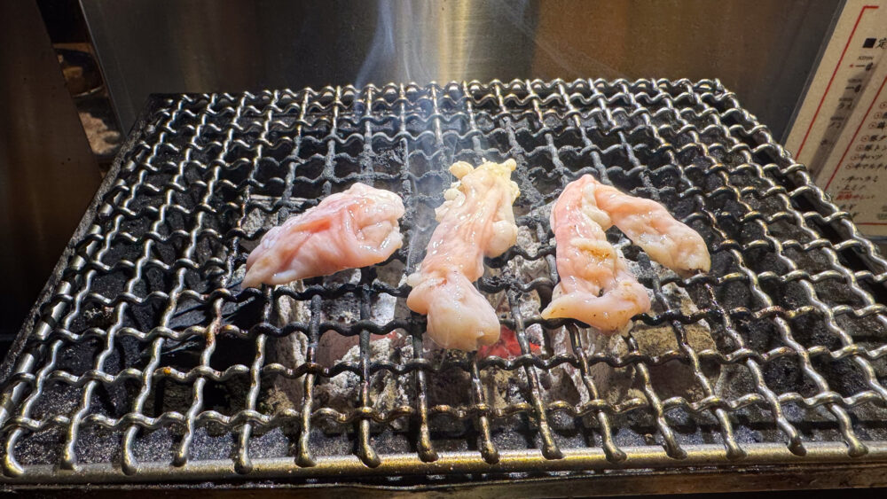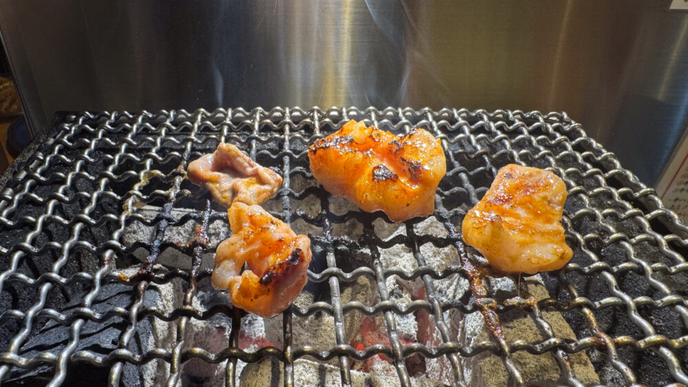 ▲牛シマチョウが良い感じに焼けてきました。脂をしっかり落として食べたいところ。