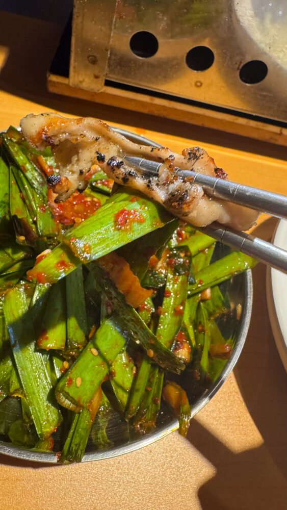 ▲焼けたペラペラ焼はタレにつけずに辛ニラと一緒に食べます。辛旨でクセになりますね。お酒にもめっちゃ合います。