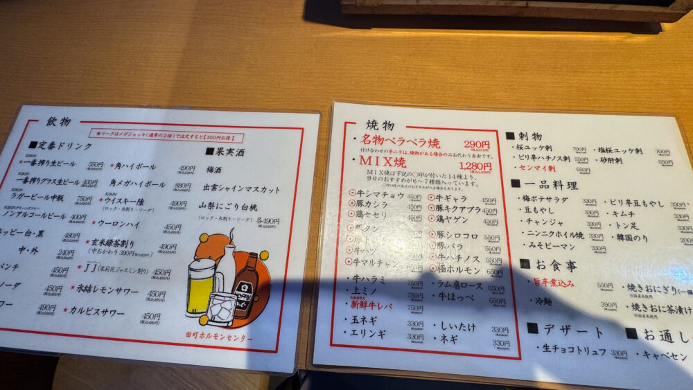 今回は一番搾り生ビール+牛シマチョウ+牛ギャラ+牛ハチノス+角メガハイボール×2+名物ペラペラ焼を注文しました!