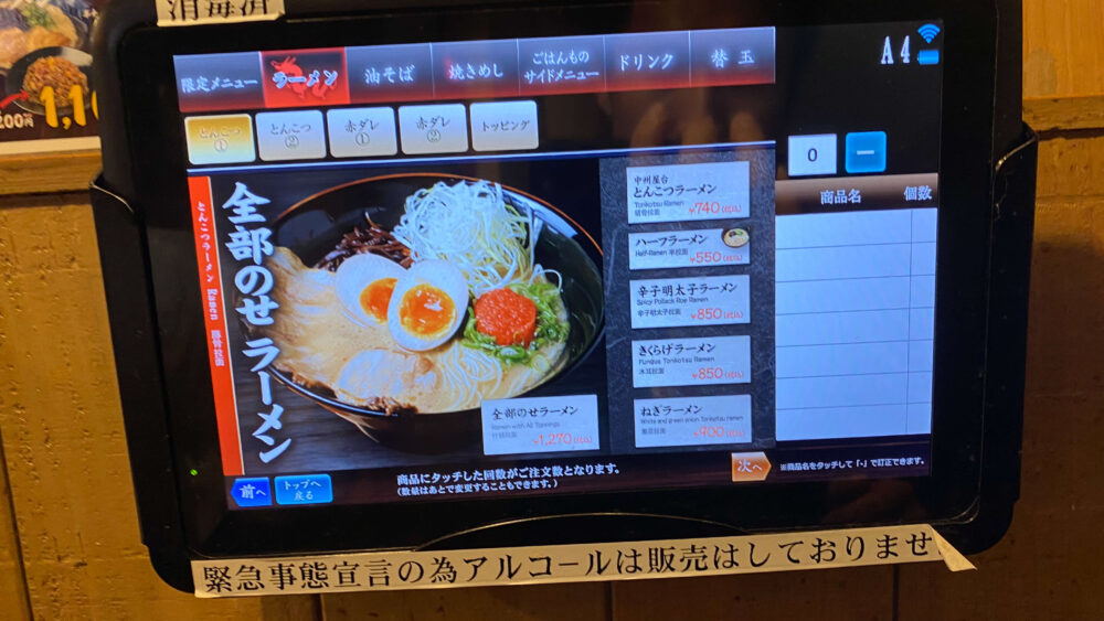▲タッチパネルで最初のメニューを注文します。(替玉もタッチパネルで注文可能)