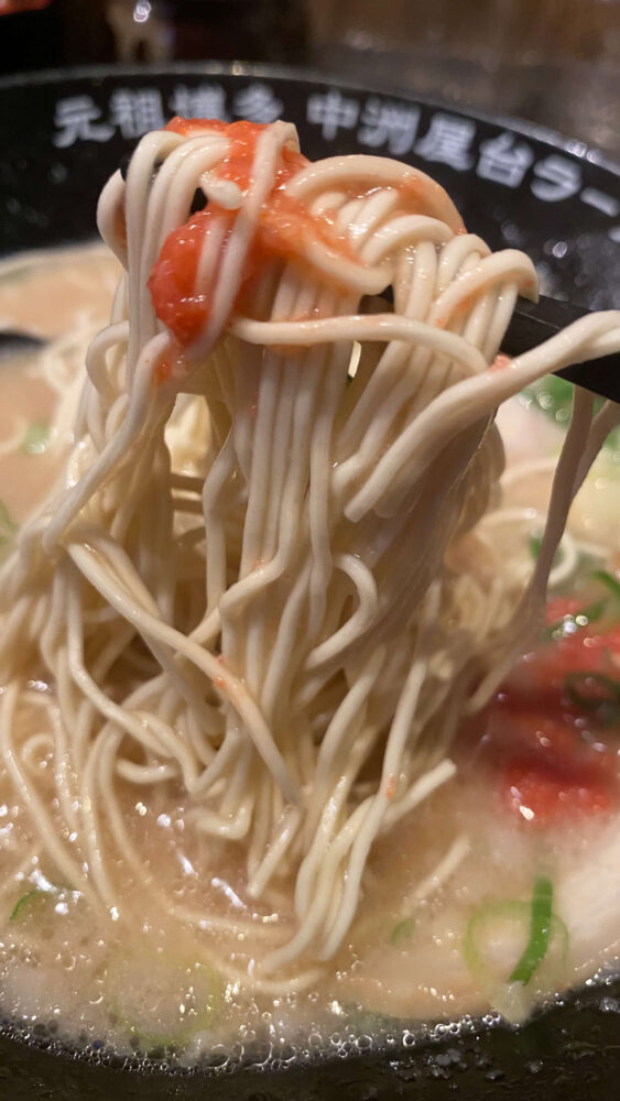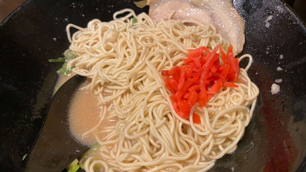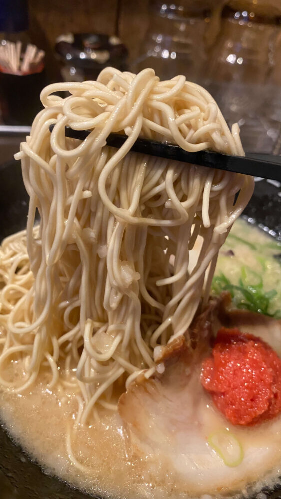 ▲豚骨ラーメンと言えばの細麺。バリカタなので、麺が文字通り固めで小麦感強め。