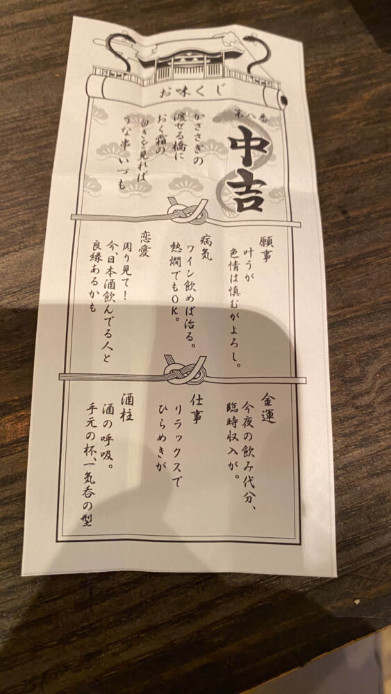 ▲お箸カバーがおみくじ(お味くじ)になっています。私は中吉でした。