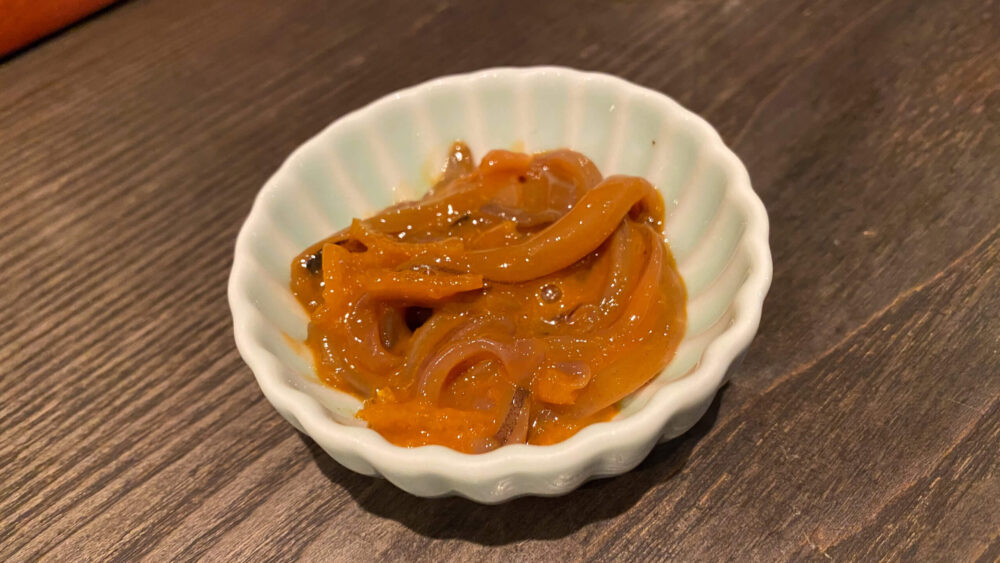 ▲お通しは3種類から選べましたが、柚子塩辛をチョイス。塩辛の塩味の後に柚子の清涼感が追っかけてきて美味。