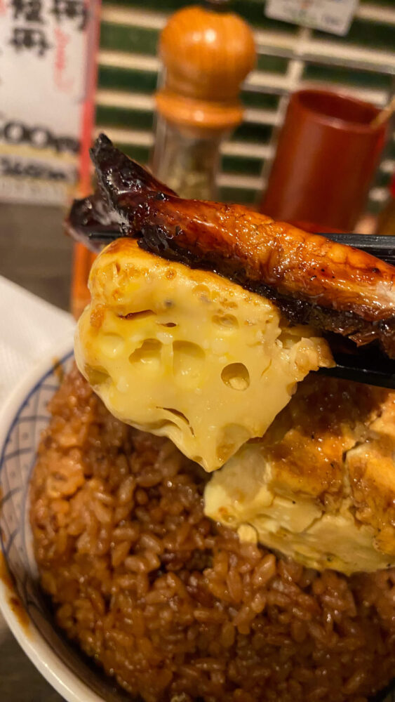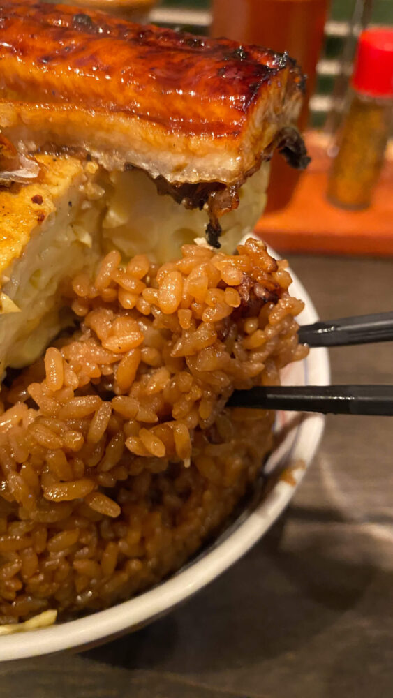 ただ、ご飯はタレがしっかり付いている分、見た目よりもずっしりと重量ある感じなので、胃のキャパに自信がない方は少なめにした方が良いでしょう(鰻と玉子に対し、ご飯の比率高め)。