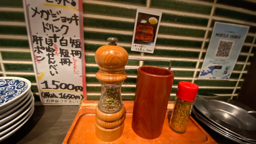 ▲右上のQRコードを読み取ると注文できます。卓上調味料は山椒と七味唐辛子。