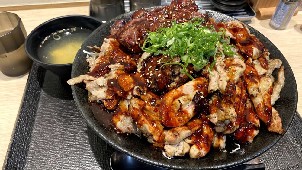 一番のデカ盛りメニューが肉激情丼で、肉の部分だけで重量1kg、ご飯など含めると3.5ポンドとのこと。