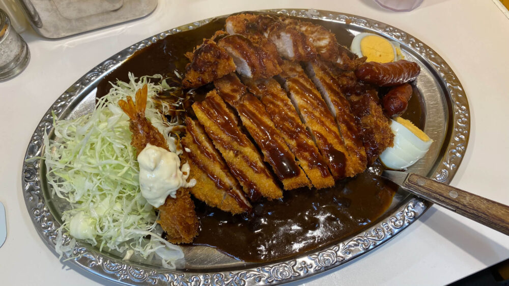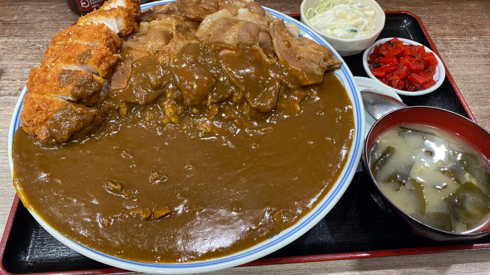 とんかつと焼肉が乗った特大カレーで、味変しながら食べることができ、なんとか完食できました!