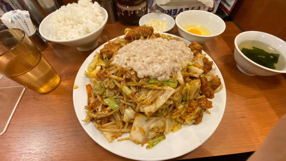 【#34】肉野菜炒め ベジ郎 池袋東口店|肉野菜炒め鬼マシうま辛ポン酢味(肉500g/背脂鬼油)+ご飯特盛・スープ(重量目安:2kg超)