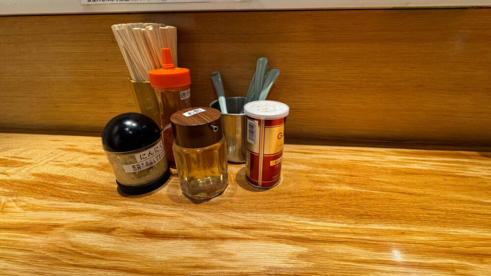 ▲卓上調味料は、にんにく、お酢、唐辛子、ブラックペッパー。