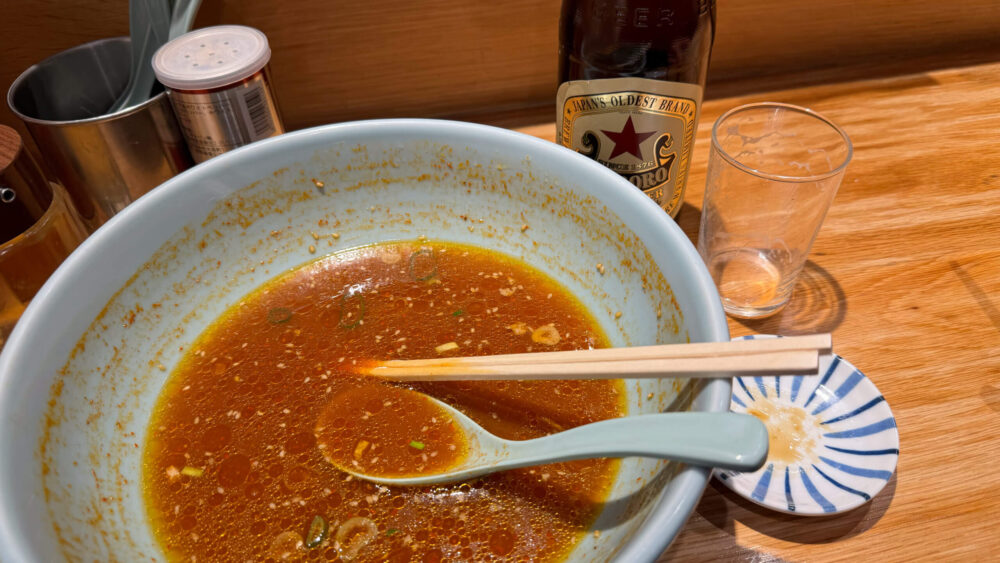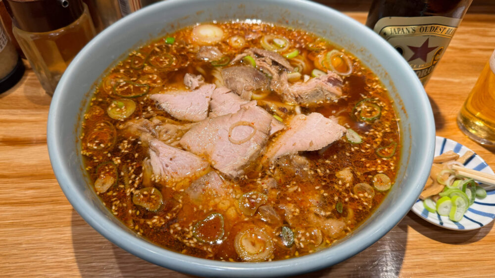 「チャーシュー麺+麺大盛り+辛くする(3辛)+赤星ビール」を実食!