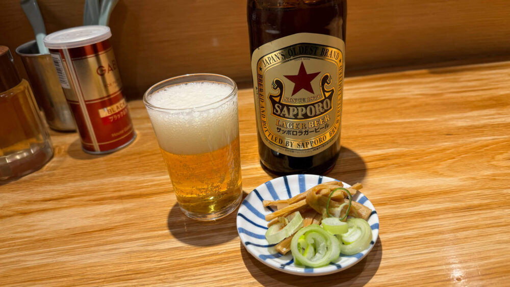 ▲瓶ビールはサッポロラガー。おつまみも付いて、ネギとメンマです。仕事終わりのビールは最高ですね。