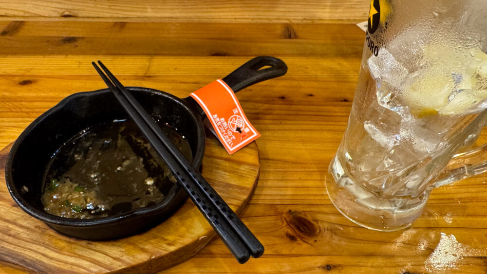 「いつものレモンサワー+ずり唐(砂肝唐揚げ)+煮込み(こってり脂しょうゆ)+大人のこてっちゃん+おやじ好みの梅サワー+白バクハイ(生ビール&マッコリ)」を実食!