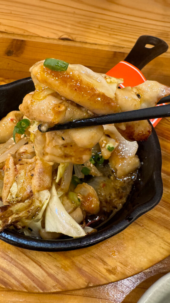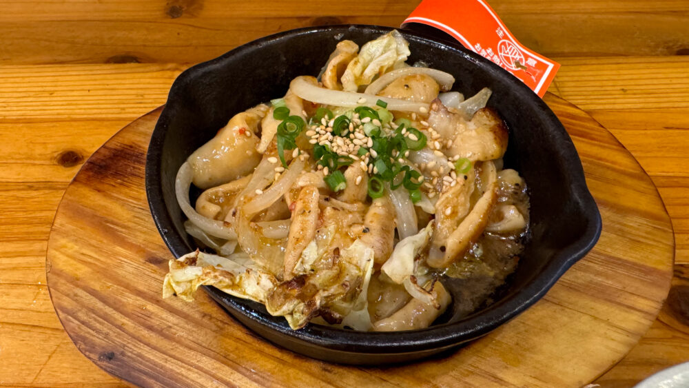 ▲大人のこてっちゃんも着皿。大ぶりのホルモンがアツアツな鉄板での提供です。