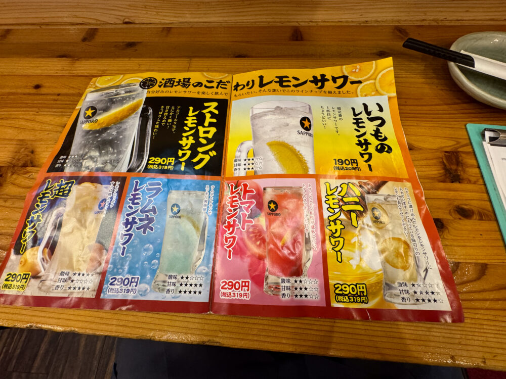 あと、お酒のメニュー種類も豊富で、レモンサワーや梅サワーの中でもたくさん種類あって迷う楽しさもあります。
