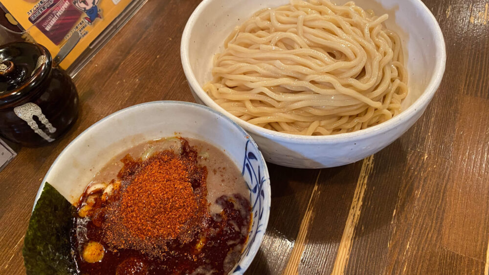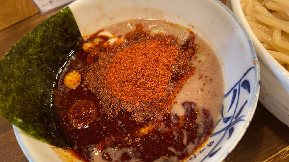 濃厚な魚介豚骨系のつけ汁にドサッと入った辛魚粉が辛そう!麺も太くて美味しそうです!