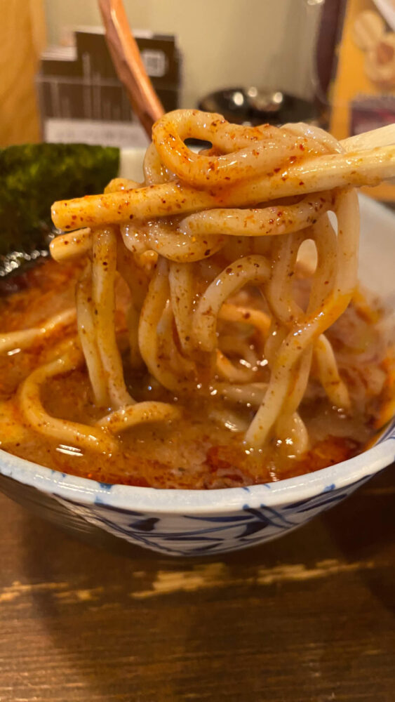▲麺はツルモチでコシが強め。太めにしたのでかなりの太麺です。