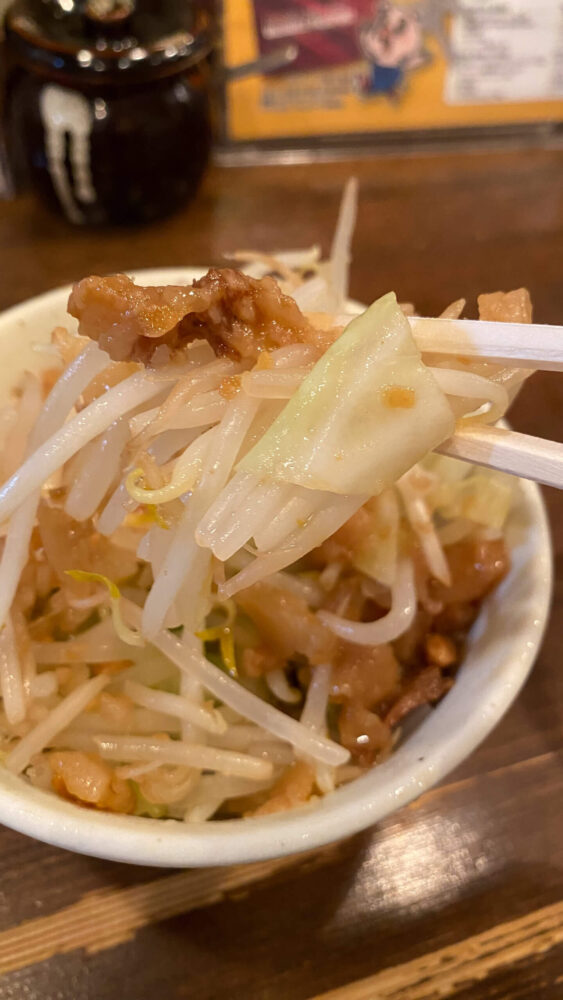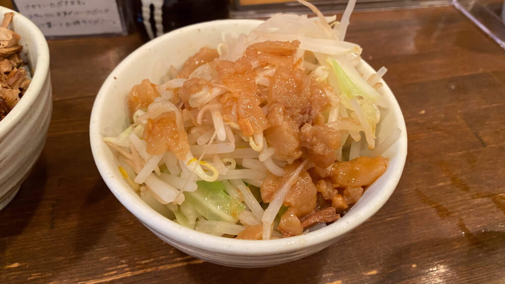 ▲まずはジロベジが到着!ジロベジは茹でたもやしとキャベツに背脂で二郎系のアブラサラダ。