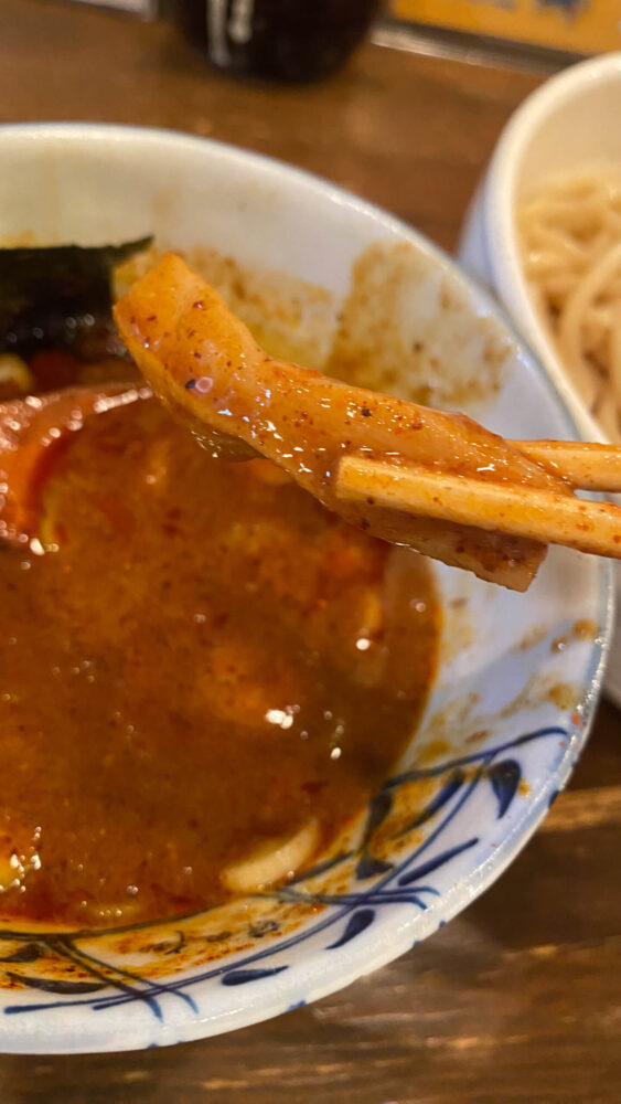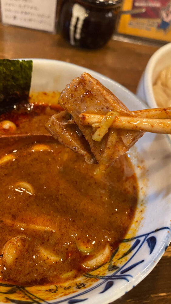 ▲つけ汁には角切りのチャーシューが入っています。これまた旨辛。
