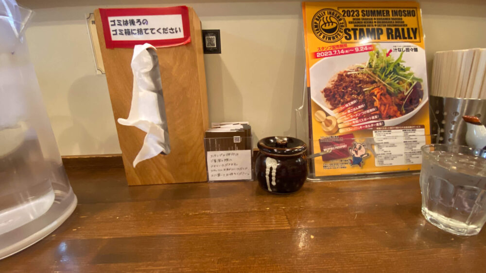 ▲卓上調味料はお酢や黒胡椒、一味唐辛子。クーポンも用意されています。