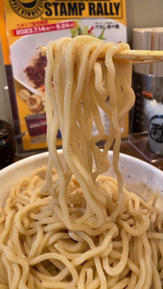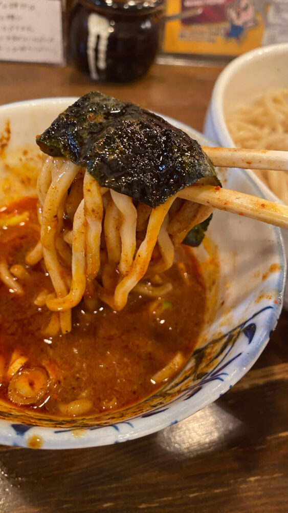 ▲この麺をつけ汁へ投入!魚粉の旨味と唐辛子の辛さが効いた濃厚つけ汁で食べる太麺が旨辛。