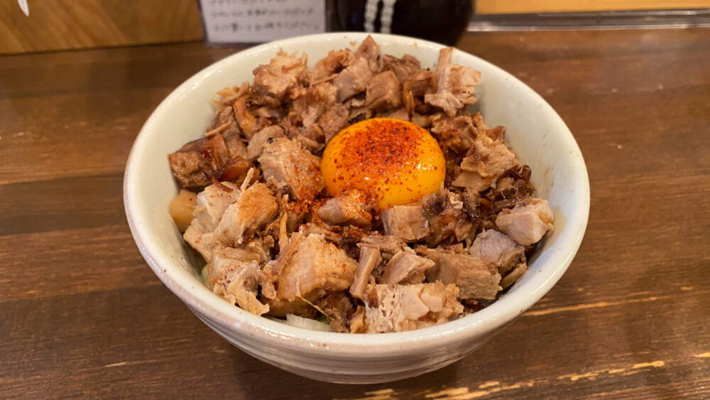 ▲豚ごはんも合間に食べていきます。ご飯の上に敷き詰められた豚肉と中央の卵黄が最高のビジュアル。
