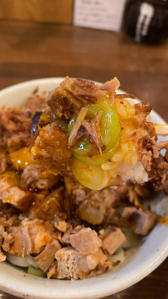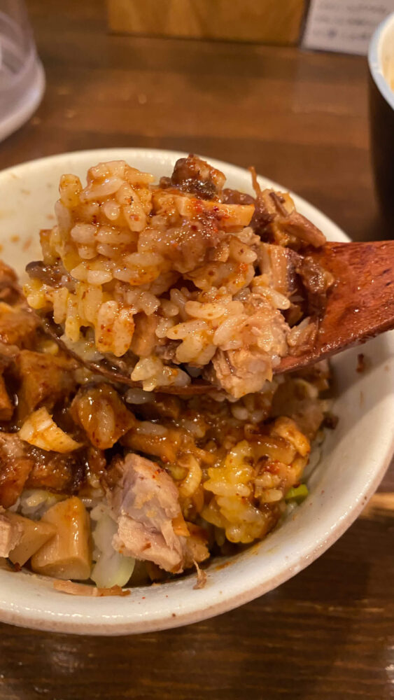 ▲麺を食べ終わった後、残りのつけ汁を豚ごはんへ投入し雑炊風に。これがまた最高!