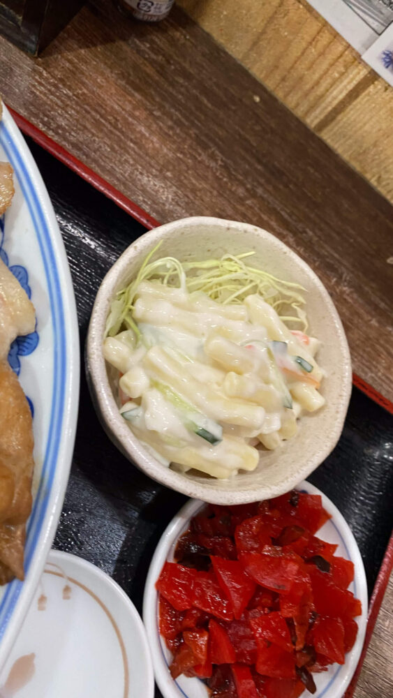 ▲味噌汁以外にも付け合わせでマカロニサラダと福神漬けが付いてきます。
