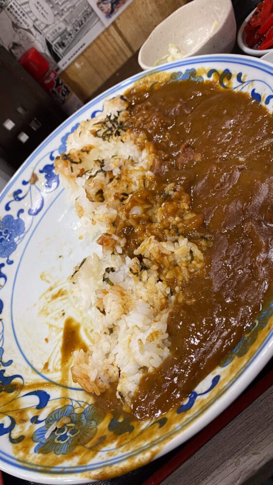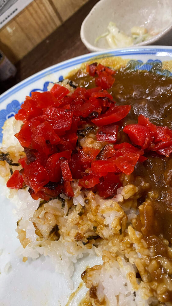 ▲残しておいた福神漬けで味変し、ラストスパート!