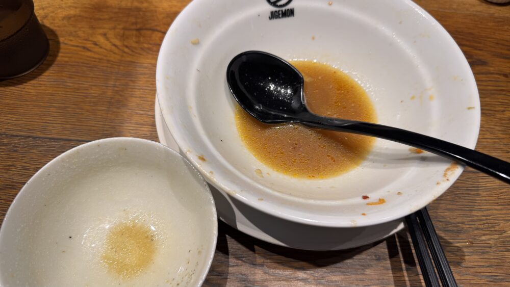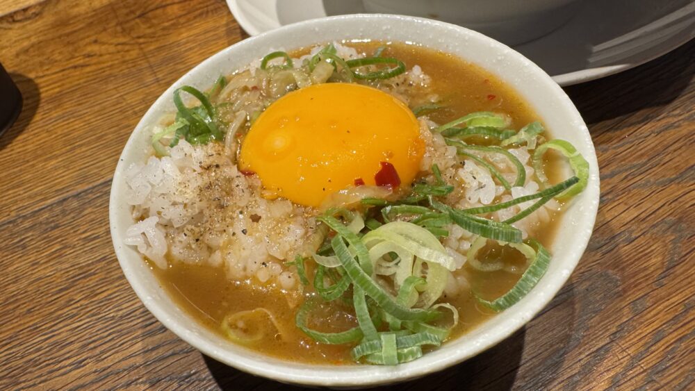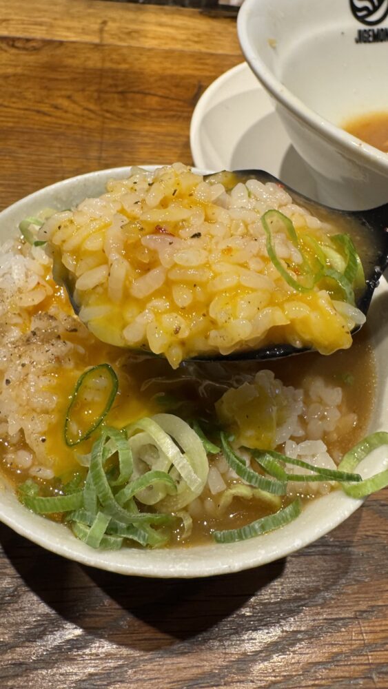 ▲ちゃんぽんを食べ終えたら、あと玉メシへスープをひたひたに入れて雑炊風に。
