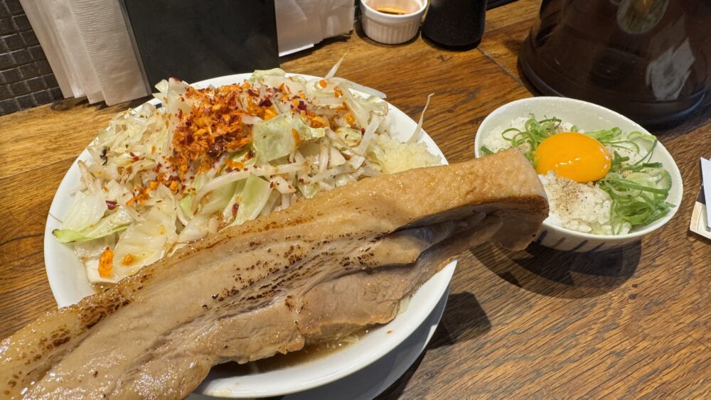 今回は肉塊!じげ郎ちゃんぽん+野菜増し+あご玉メシを注文しました!