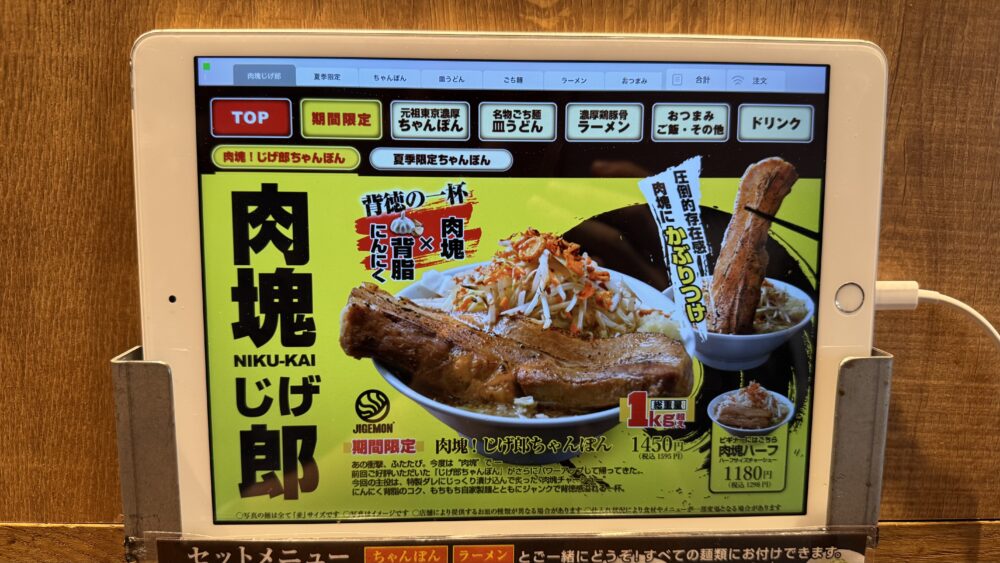 お店は30店舗以上ありますが、肉塊!じげ郎ちゃんぽんが食べることができるのは、代々木店、Esola池袋店、品川シーズンテラス店、ミッテン府中店、武蔵境店の5店舗限定なので、ご注意くださいね。