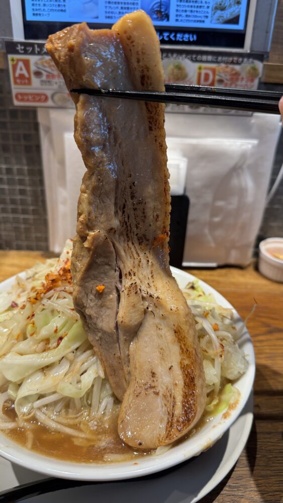 ▲肉塊チャーシューは持ち上げると圧巻。甘めな味付けにブリンとした食感が旨い。