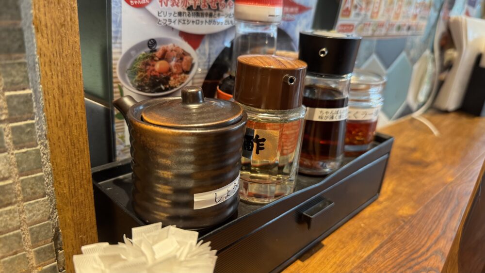 ▲卓上調味料は、しょうゆ・お酢・ちゃんぽんタレ・にんにくラー油など。