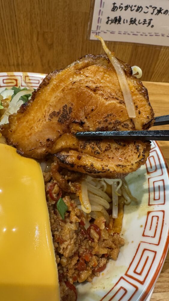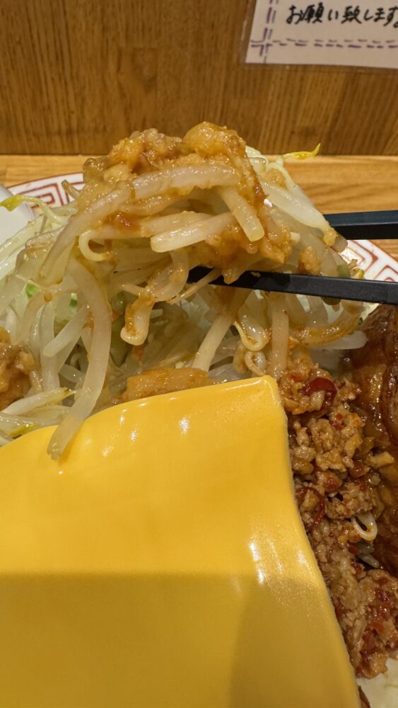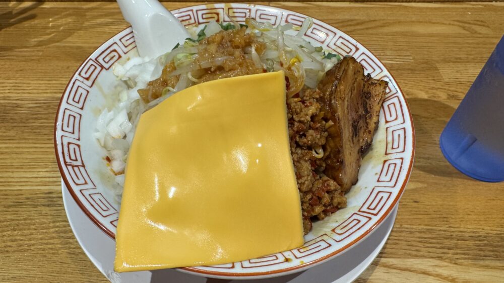 台湾ミートチーズが着丼!二郎系の台湾まぜそば的なものに大きいスライスチーズが乗って美味しそう!