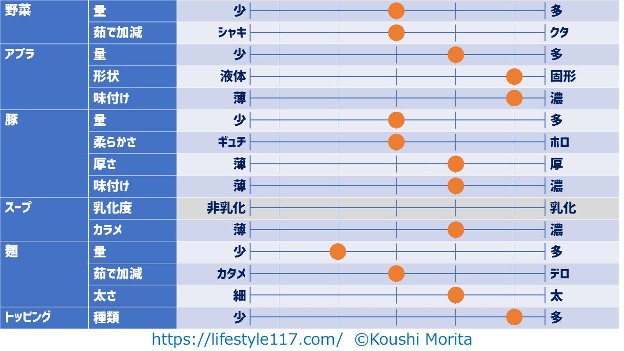 まぜそばのため、スープの乳化度はグレーアウトしています。
