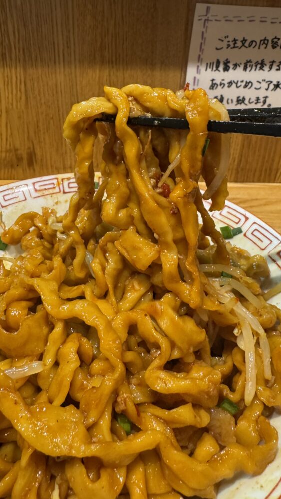 ▲ある程度上物を食べたら、しっかりタレと具材を混ぜ合わせていきます。茶色に染まった麺が美味しそう。