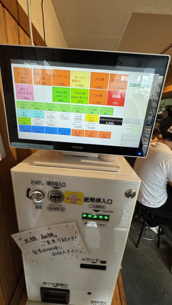 ▲店内の券売機で注文します。タブレットですが、お金は現金のみ(新紙幣NG)。