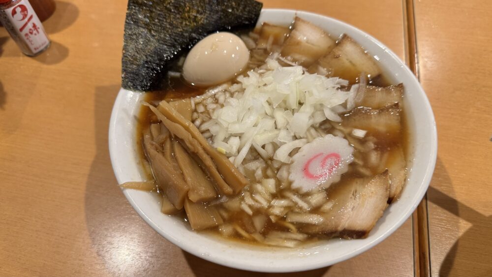 特製竹岡式ラーメンが着丼!チャーシュー・メンマ・海苔・味玉・玉ねぎとトッピングが豪華!