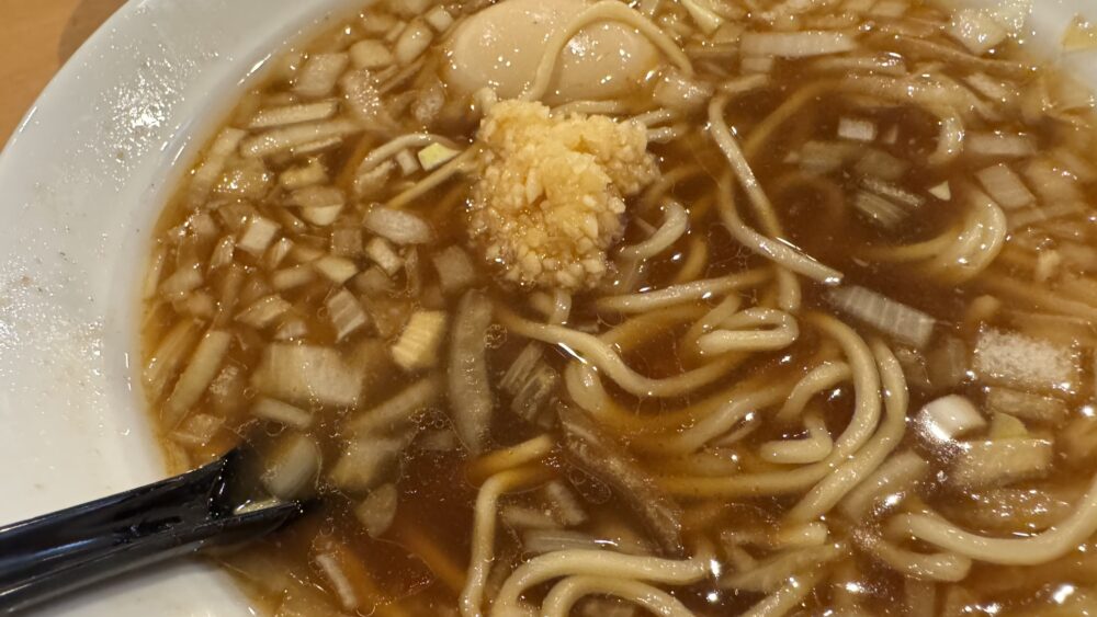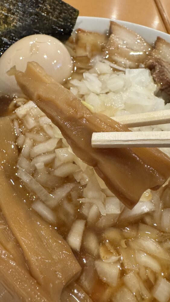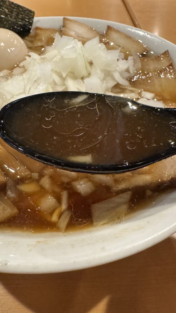▲スープは、醤油が効いて濃いめなのに、刻み玉ねぎでちょうど良いバランスになって旨い。